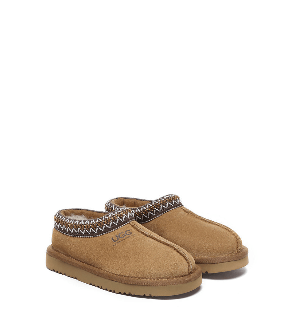 Treat little feet to cozy style with our Tazzy Hippie slippers, the perfect mini-me match to our adult styles. Crafted from premium Australian sheepskin, these adorable slippers keep tiny toes warm while making a boho-chic statement. The ethnic embroidered details add playful flair, while the non-slip EVA sole makes them practical for indoor and outdoor adventures.